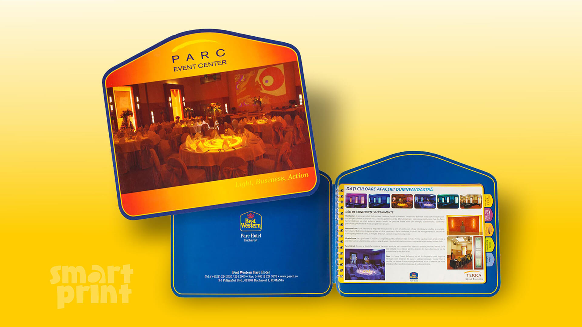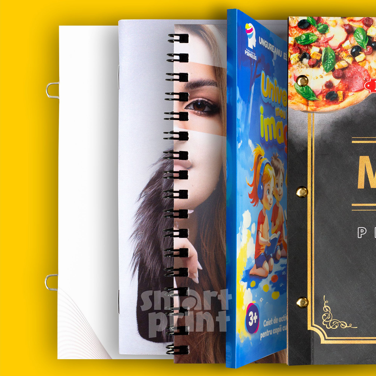 Coperțile și filele de la interior pot fi decupate pe diverse forme prin ștanțare. Am realizat destule proiecte unice pentru clienții noștri, am acumulat multă experiență și suntem mereu deschiși la noi provocări. Putem oferi opțional, pentru cine dorește un produs de lux, finisaje premium: folio, lac selectiv în relief sau plan, emboss, plastifiere soft touch, etc.